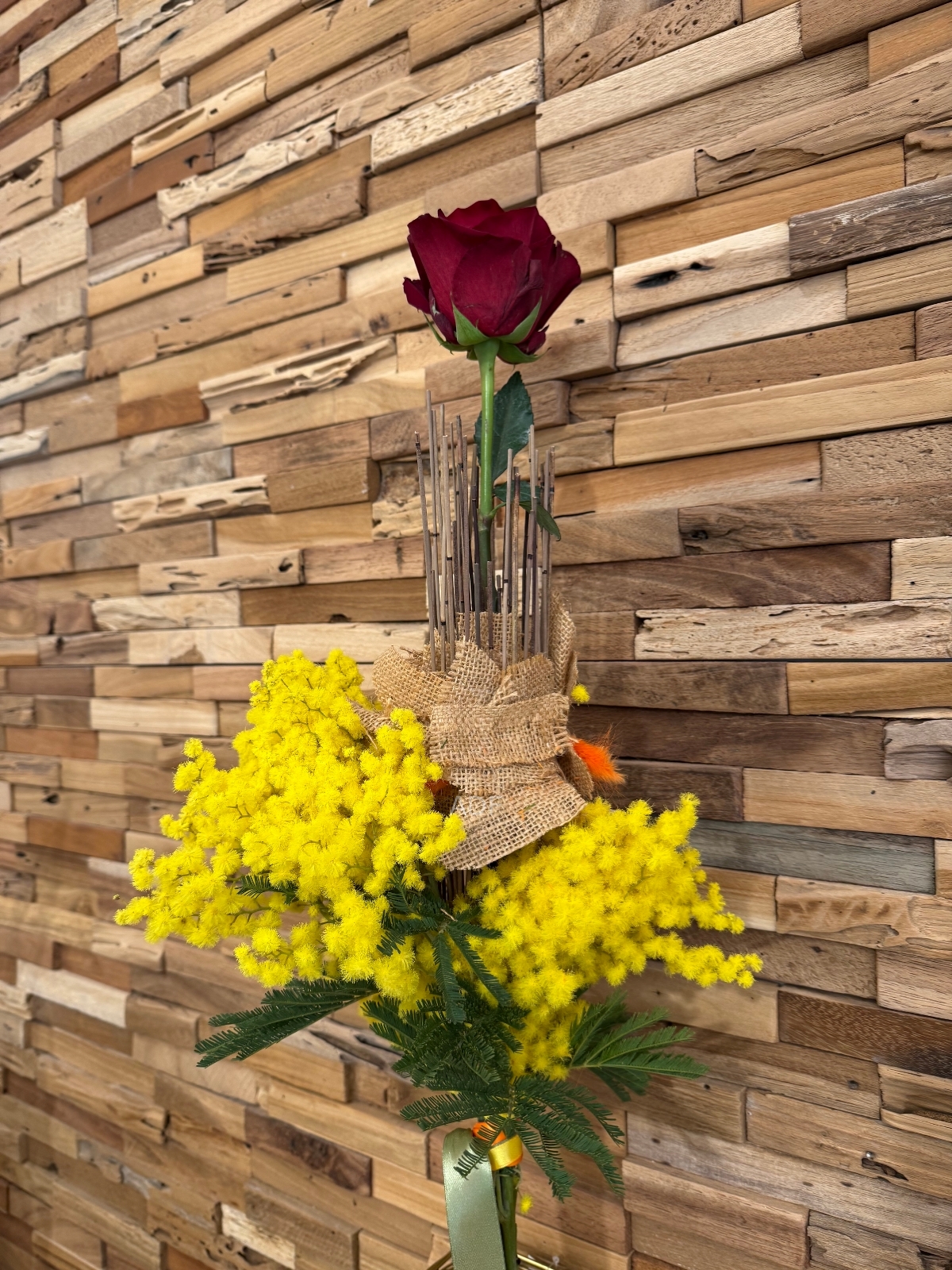 Ogni rosa rossa è abbinata a morbide fronde di mimosa, creando un mix perfetto di eleganza e freschezza. La nostra attenzione per i dettagli e la qualità artigianale rendono ogni composizione ideale per ogni occasione, che si tratti di un anniversario, una festa o semplicemente per esprimere i tuoi sentimenti.